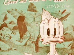 Talk about Duck and Cover! A rare wartime propaganda poster from World War II using Donald Duck to urge soldiers to use condoms (prophylactics), is being auctioned off this month by Hake’s.