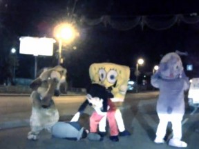 Here’s a heartwarming moment of corporate cooperation as cartoon characters owned by four different entertainment conglomerates—Mickey Mouse (Disney), Bugs Bunny (Warner Bros.), Scrat (20th Century Fox), and SpongeBob (Viacom)—team up to beat the living crap out of a real-life human being.