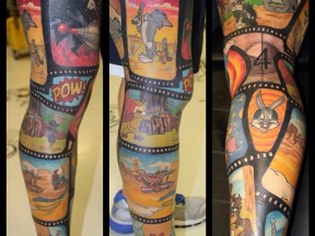 This tattoo sleeve of classic cartoon characters is so impressive that I’m even willing to overlook that the artist used Chuck Jones’ redesign of Tom & Jerry.