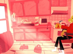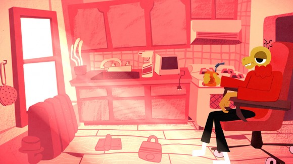 Melancholy crocodile stores a funny feeling under floor. When he decides to let loose, the eyes return and tie his noose.