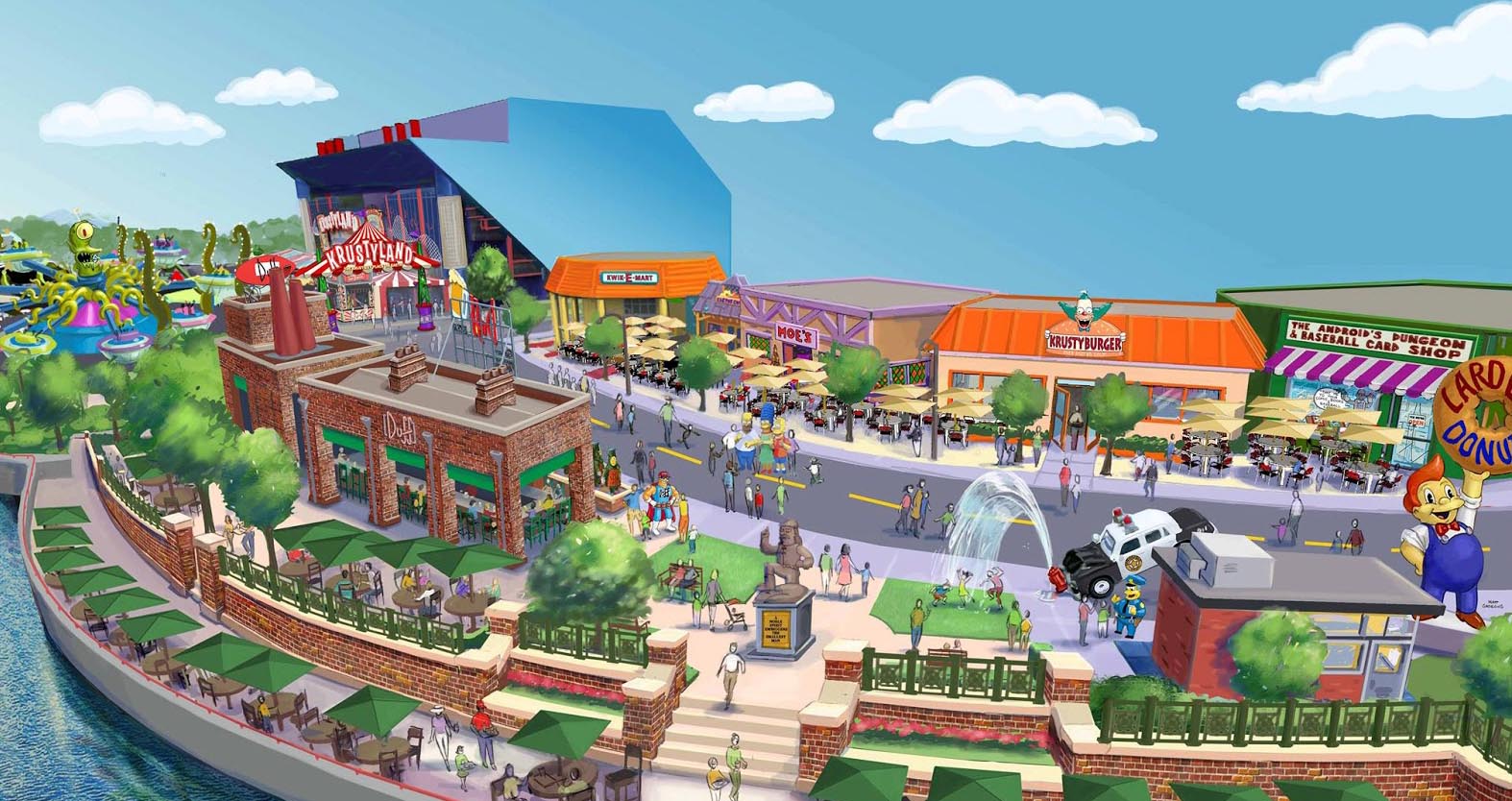 The area will also feature a new attraction—Kang & Kodos’ Twirl ‘n’ Hurl—as well as the statue of Springfield founder Jebediah Springfield. Cick on the image at top for a close-up rendering of the new area.