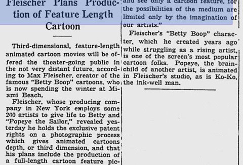 Popeye authority Fred Grandinetti found this clipping in The Miami News (published on December 25th, 1936) in which Max Fleischer predicts a day when audiences will flock to theatres to see 3-dimensional cartoon feature films! Of course, Uncle Max was thinking more along the lines of his Stereo-Optical process, using three-dimensional sets and not computer graphics. Nor motion capture (despite his invention of the rotoscope). Still, Max was a visionary…