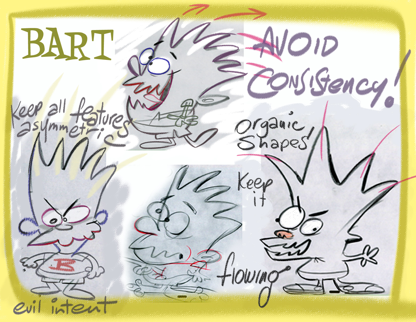 JK: The Simpsons are very stylized to begin with and their features do not wrap around their forms. Neither do 50s UPA style cartoons. But they do have hierarchy and internal logic of some kind. They use controlled abstraction rather than arbitrary unbalanced distortion.