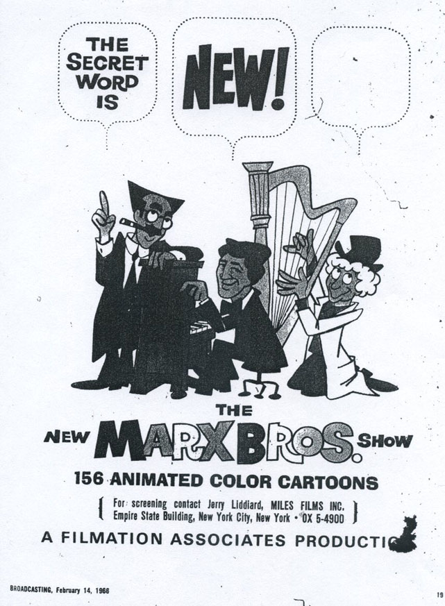 Thank God for small favors… As far as I know this show doesn’t exist. Fred Grandinetti sent me this trade ad from Broadcasting Magazine (February, 1966) offering a Marx Bros. cartoon package from Filmation. Was there be a pilot? The ad offers a screening, so… could be? This was in the era when Hanna Barbera was producing Abbott and Costello, and Laurel and Hardy cartoons. In light of what Filmation would do to Jerry Lewis a few years later, let’s consider ourselves lucky the brothers Marx weren’t subjected to their cheapjack production methods.