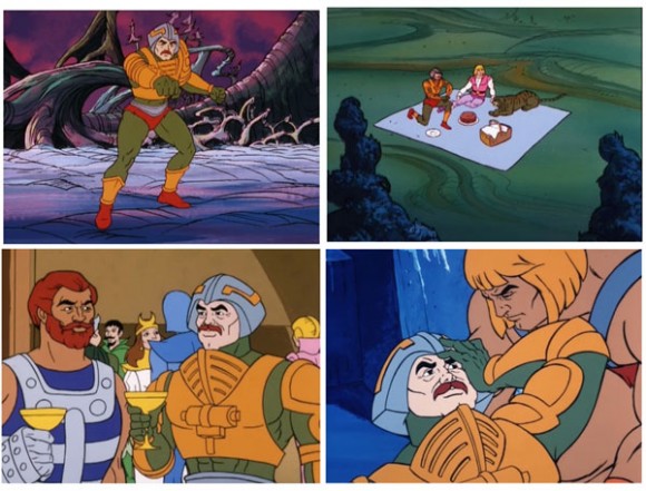 A middle-aged man with bare midriff armor, a Seventies ‘stache and nothing better to do than go on long trips with Prince Adam and keep his secrets? The whole thing reeks of human growth hormone, a secret past and late night slap-and-tickle in the darkened corridors of Castle Grayskull.