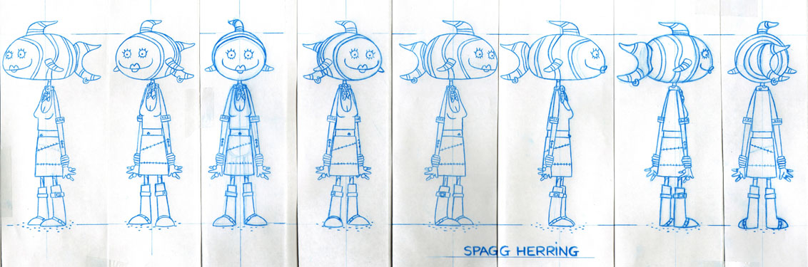 “Yes, it’s a TV pilot. We started the process back in 2008 when we went down to Cornwall for a week and just came up with characters, location details and story ideas. Then we wrote a bible, script and designed the characters we liked to finished artwork. We basically made it off our own backs — we wanted to show we could make longer form stuff as well as all the shorts we’ve made. We stumped up half the money ourselves and found the rest from the MEDIA fund in Europe. We used professional comedians and actors to do the voices including Richard Ridings (who was in Who Framed Roger Rabbit). We finished the animation last year — most of it was animated by the very talented Tom Evans and Kirsten Thacker, though there were others involved too, not least Robert Brown who did all the beautiful hand drawn moments — like the fire and the sea lapping on the beach. He also prepared the turnarounds (I’ve attached one of the sheets – click to enlarge)”.