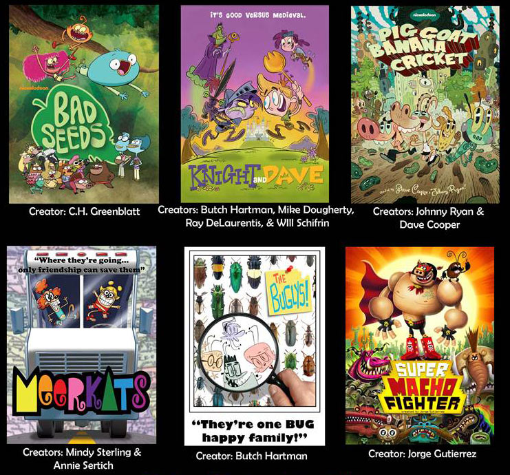 [UPDATE—Thurs, 11:55pm ET]: A source at Nickelodeon tells Cartoon Brew that Bad Seeds and Pig Goat Banana Cricket were in the running against four other series pilots, including two by Butch Hartman (creator of The Fairly OddParents, Danny Phantom) and one by Jorge Gutierrez (co-creator of El Tigre: The Adventures of Manny Rivera). The source made clear that though those other shows weren’t greenlit, some of them may still be pushed into series at some point in the future. Here’s a look at the six shows that were being developed internally at Nick. Click for bigger image: