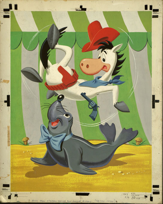 My friend Fred Patten owns this original Quick Draw McGraw painting (click on it above, or here, for enlarged image) created for a frame tray puzzle. Both of us are stumped as to who may have painted it. I’m no expert on merchandising art, but it doesn’t look like the usual suspects at Western Publishing to me (Pete Alvarado, Mel Crawford, Hawley Pratt, etc.) – or is it? Anyone have any theories?