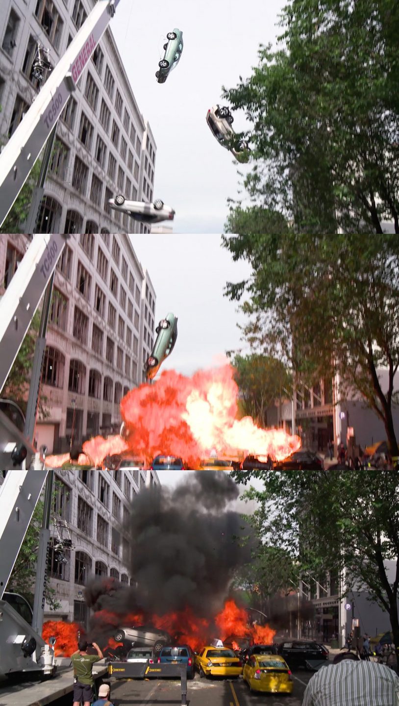 The set-up for this sequence is simple: the film’s villain, Cipher (Charlize Theron), attempts to infiltrate and attack an important motorcade driving through New York city by remotely taking control over other cars in the streets. The ensuing chaos involving hordes of cars is further enhanced by vehicles that launch themselves out of a multi-story car park onto the road below.