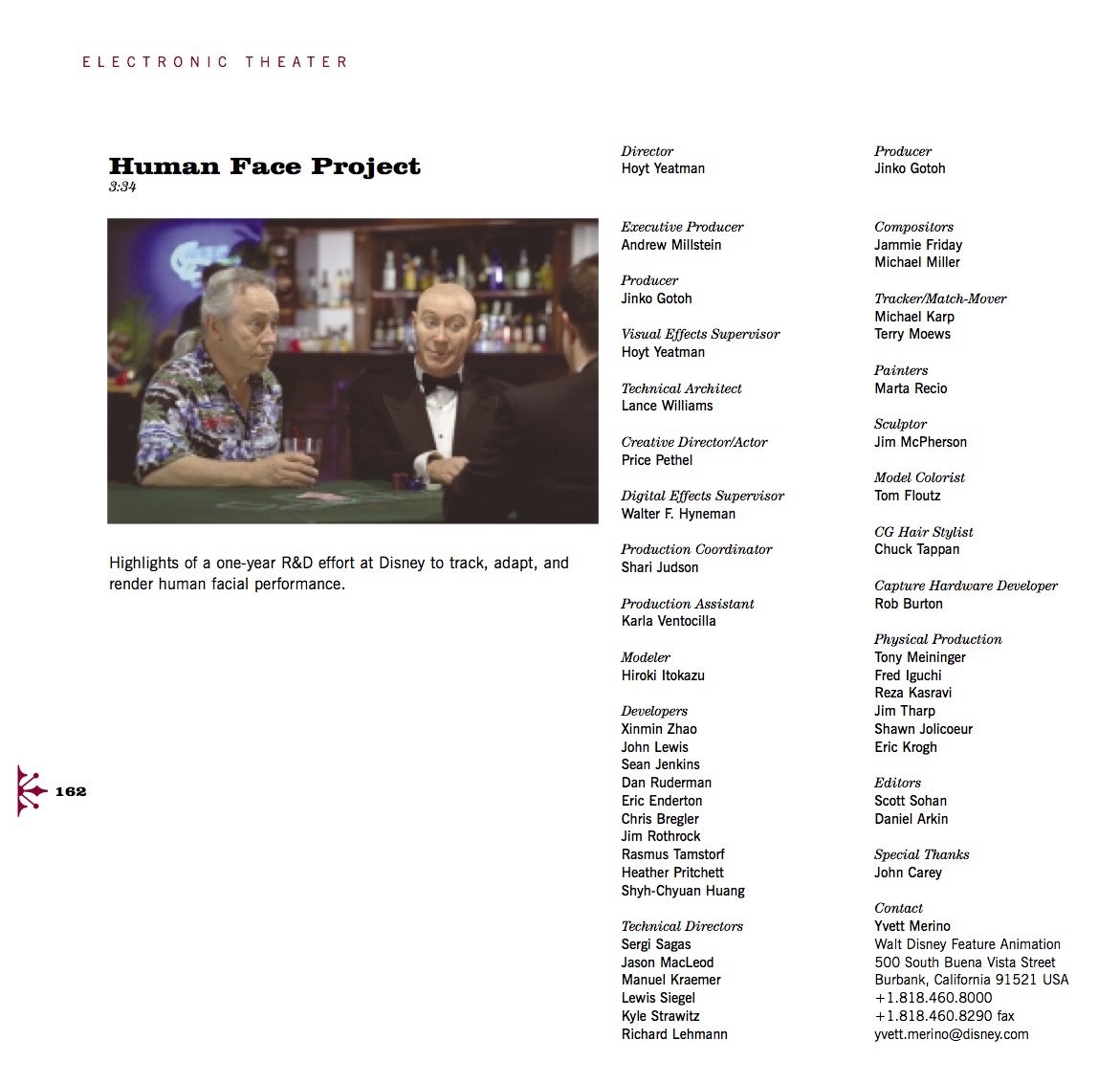In the early 2000s, Disney had artists from Walt Disney Feature Animation and (the now-defunct vfx studio) The Secret Lab carry out tests to capture a human performance and create a corresponding – and younger – digital human avatar. The results, impressive for their time, were not enough to push the project forward. However, the people behind the technology were able to present their findings at SIGGRAPH 2002 in a short film called Human Face Project, directed by Hoyt Yeatman, and later at SIGGRAPH 2005 as part of a course on digital face cloning.