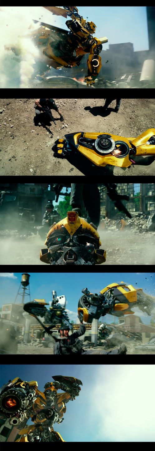 Arriving in his Chevrolet Camaro form to respond to the Transformers Reaction Force (TRF) – set up to eliminate the alien robots – Bumblebee disassembles into separate pieces. Then, he ‘transforms’ back into his humanoid form, each metallic piece jettisoning toward each other and in the process taking out several TRF adversaries, often in long slow-motion shots.